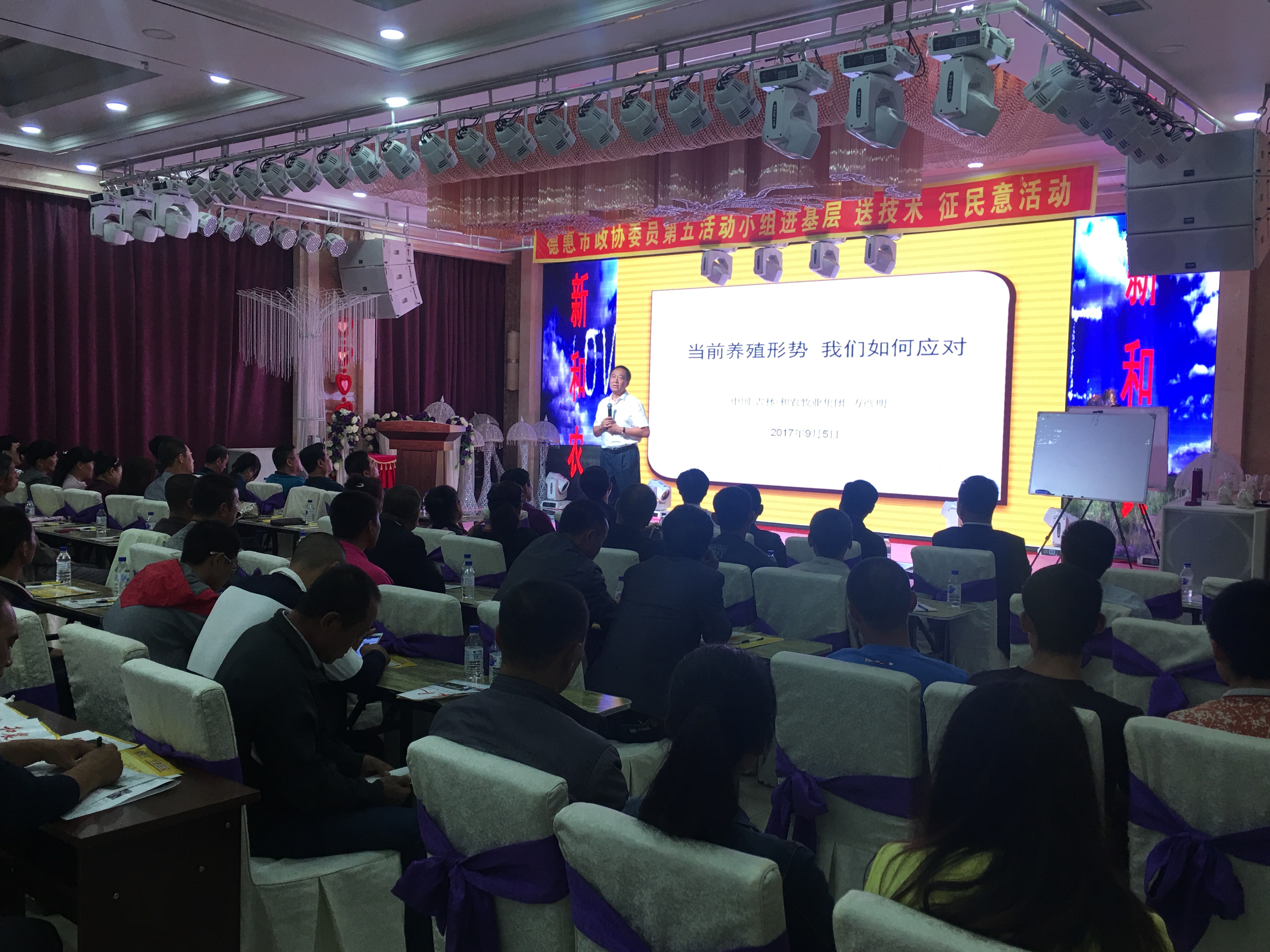 由和農(nóng)牧業(yè)集團(tuán)主辦,德惠榮豐聯(lián)社、德惠市政協(xié)委員會(huì)協(xié)辦“新和農(nóng)蛋雞養(yǎng)殖雙卡新模式”送溫暖傳技術(shù)基層科普推介會(huì)在德惠華宴大酒店隆重召開,現(xiàn)場參會(huì)大型養(yǎng)殖場120人。