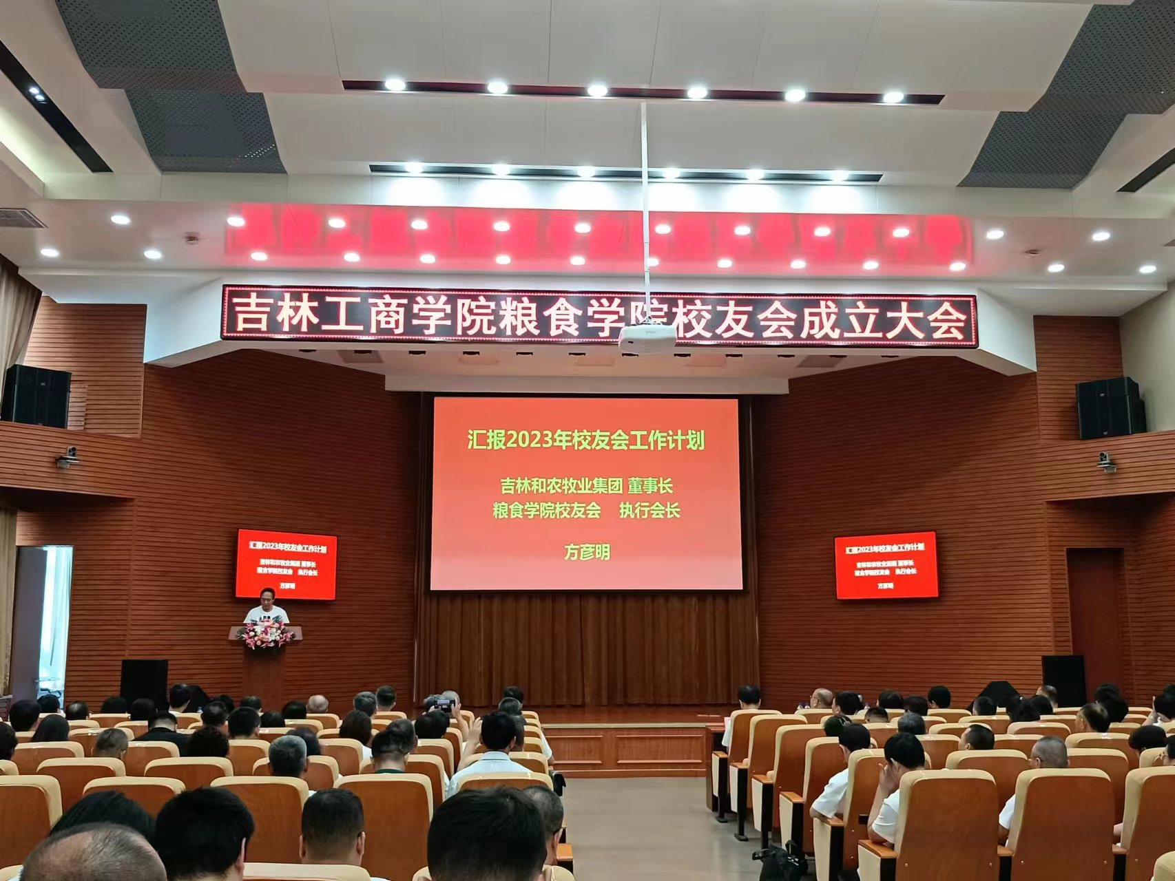 糧食學(xué)院校友會(huì)執(zhí)行會(huì)長(zhǎng)、糧食工程專業(yè)8104班校友、吉林省和農(nóng)牧業(yè)集團(tuán)董事長(zhǎng)方彥明先生向大會(huì)匯報(bào)糧食學(xué)院校友會(huì)2023年工作計(jì)劃。